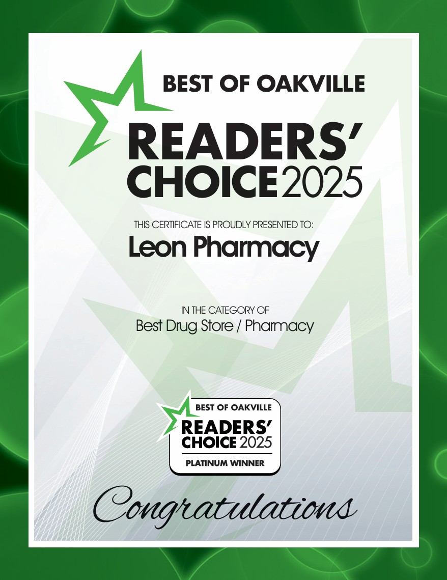 The Oakville Beaver announced its 2013 Readers Choice winners and we were proud to receive awards in the “Best Pharmacy” category. Leon Pharmacy was voted the best independent pharmacy in Oakville.